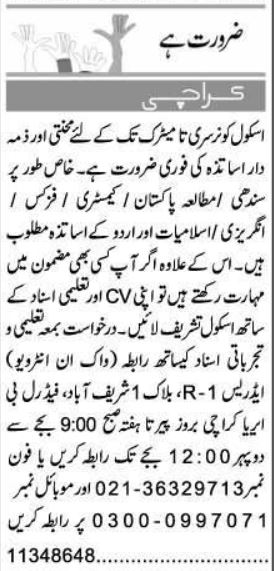 A4: The advertisement was published in the daily Express Newspaper around April 7, 2026. You can also find this information and potentially similar opportunities on educational job portals like SindhJobs.pk or the websites of the hiring schools.