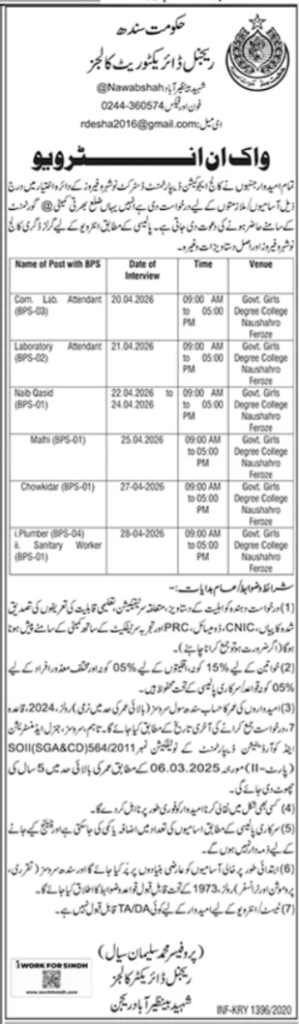 While the jobs are based in Nawabshah, the advertisement typically specifies eligibility criteria broadly, often including residents of Shaheed Benazirabad district and surrounding areas. It’s best to check the full advertisement for precise domicile requirements.